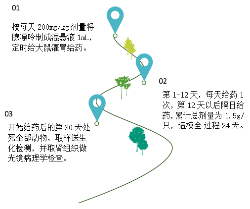 慢性肾衰竭指各种原发和继发的慢性肾脏疾病进行性恶化,逐渐出现肾功能不全发展到最终的统一性结局。目前这一概念在全球肾脏病界已被慢性肾脏病(CKD)所取代。将肾部分切除加对侧肾摘除法制作肾衰模型,存在手术复杂、制作困难、并发症多、死亡率高等缺点,而用腺嘌呤长期喂养大鼠建立慢性的肾衰模型,简单、易行,该模型通常被用于慢性肾衰期机制、药物筛选及疾病治疗等研究。